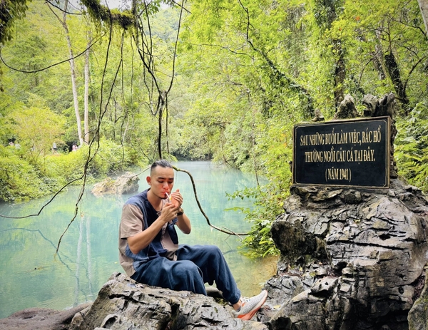 Họa sĩ Lân Vũ tại suối Lênin, Cao Bằng – nơi ghi dấu câu chuyện lịch sử về Bác Hồ. Sau những giờ làm việc năm 1941, Người thường ngồi câu cá ở đây.